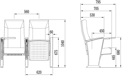 2.座椅基本中心距為560±10mm,座包打開側深為:705±10mm,寫字板打開側深為:795±10mm,椅高為1040±10mm,最小排距:900mm。