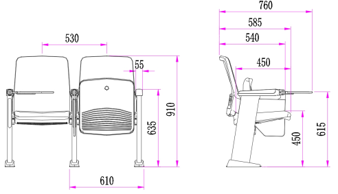 2.座椅基本中心距為530±5mm,座包打開側深585±5mm,寫字板打開側深760±5mm,基本椅高為910±5mm,最小排距:850mm。