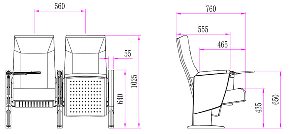 2.座椅基本中心距為560±5mm,座包打開側深760±5mm,基本椅高為1025±5mm,最小排距:950mm。