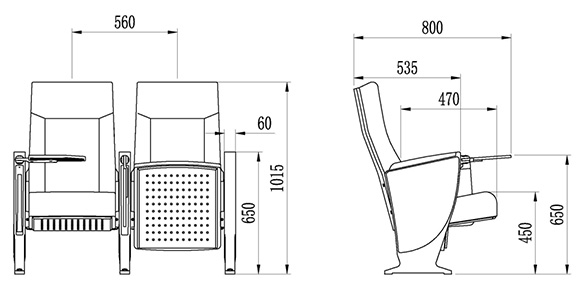 2.座椅基本中心距為560±10mm,座包打開側深470±10mm,寫字板打開側深800±10mm,椅高為1015±10mm,最小排距:900 mm。