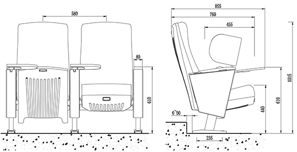 2.座椅基本中心距為580±5mm,座包打開側深760±5mm,寫字板打開側深855±5mm,基本椅高為1015±5mm,最小排距:900mm。