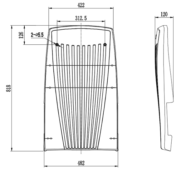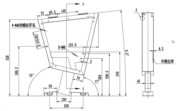 10.座椅站腳采用優質1.8mm厚碳素冷軋鋼經模具沖壓、焊接、打磨、除油除銹后靜電噴涂而成,堅固耐用,防銹耐腐蝕。左右兩側配有側板并面覆麻絨布,美觀且防撞。站腳尺寸為:長度為586±5 mm,寬度為427±5mm,高度為80±5 mm。