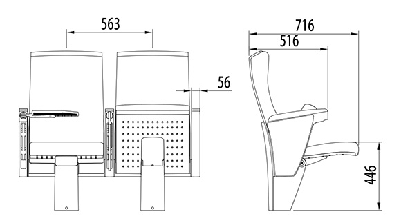 3.在保證觀眾舒適度的前提下,背墊高不超過(guò)1015mm,增加椅背板的聲反射面積,改善座椅的吸聲;座底板根據(jù)需要打吸音孔,使座椅的吸聲量在不同的上座率盡可能保持一致。